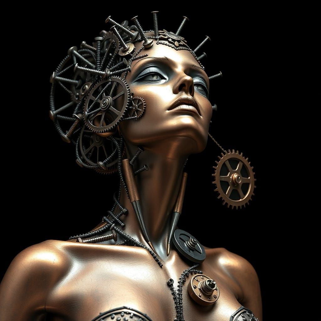 A detailed steampunk sculpture of a woman formed from screws and nails, featuring integrated gears. Dramatic lighting with an industrial palette highlights the biomechanical and Art Nouveau influences.