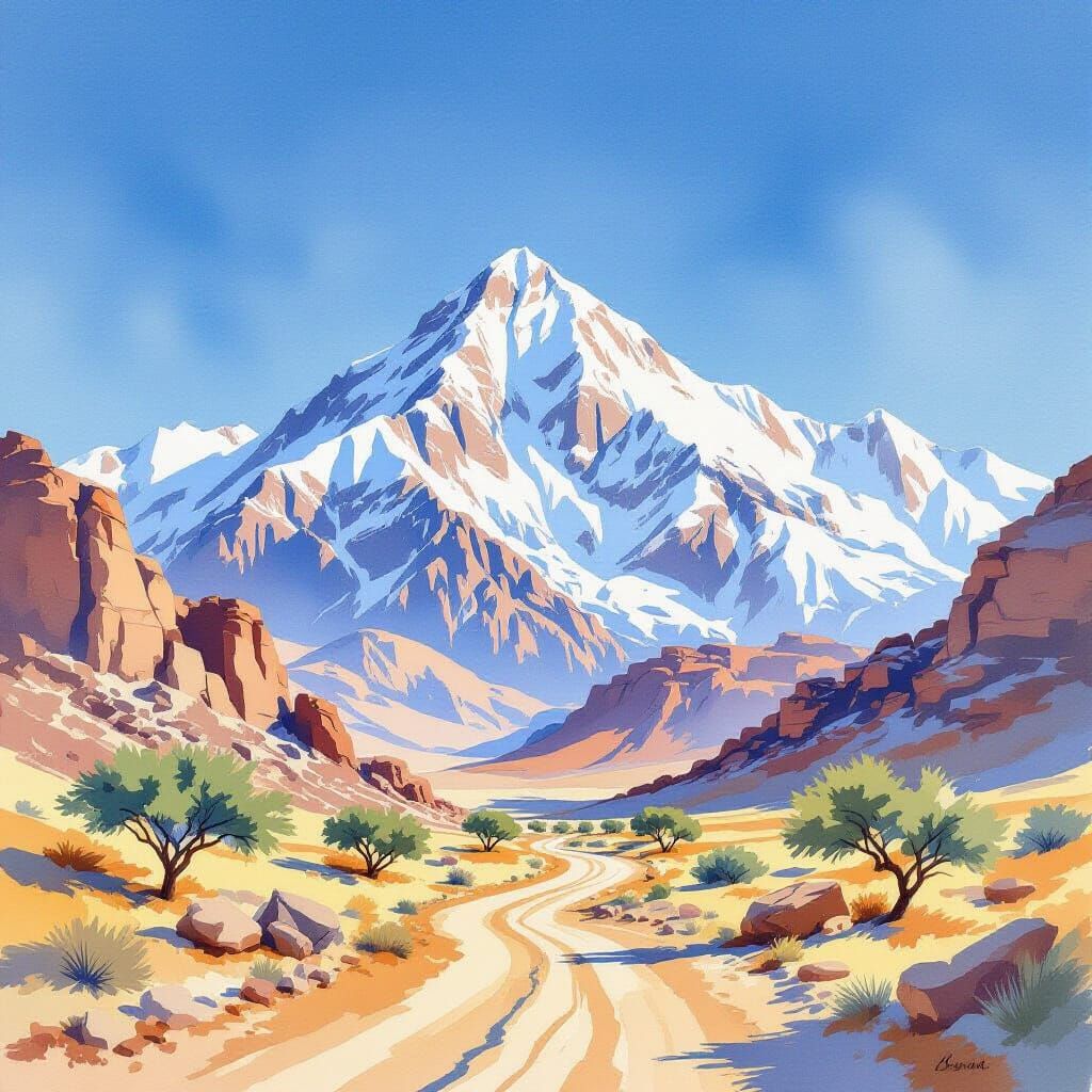 This image shows a watercolor painting of Jabal Al Lawz mountain in Saudi Arabia. The mountain rises above desert foothills with a dusting of snow on its peak, in a scene that captures the stark contrast between desert and winter.