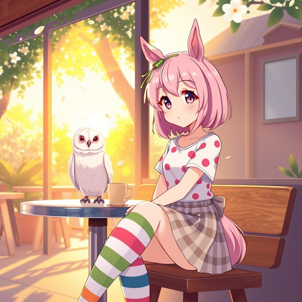 This image shows a sweet anime girl with pastel pink hair and horse ears, dressed in a colorful outfit, sitting in a cozy coffee shop amidst warm sunlight and fluttering flower petals. Rendered in a vibrant, Studio Trigger-inspired style with bold lines and flat colors.