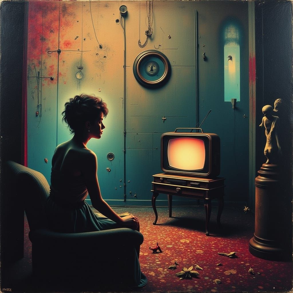 The daily news on television. Intensely surreal imagery and atmosphere, hypnagogia, paranoia, psychosis, hallucination, delusion, obsession, dissociation, clinical depression, glitches in reality, melting, merging, liminal, we don't need no thought control, a mixture of 20th century Surrealist influences, ...