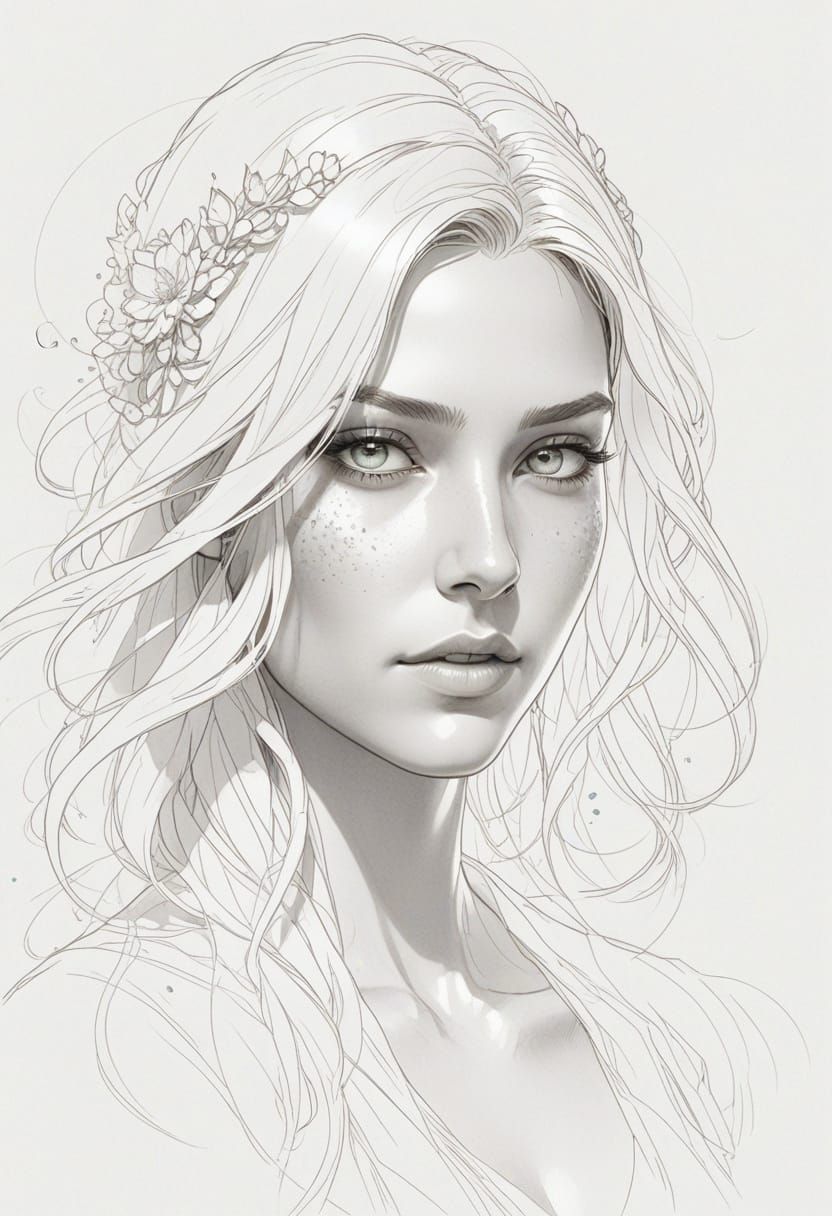 This image showcases a stunning, hyper-realistic portrait of a young woman with intricate details in her hair and clothing, set against a backdrop of vibrant, dynamic lighting with golden hour tones and soft shadows.