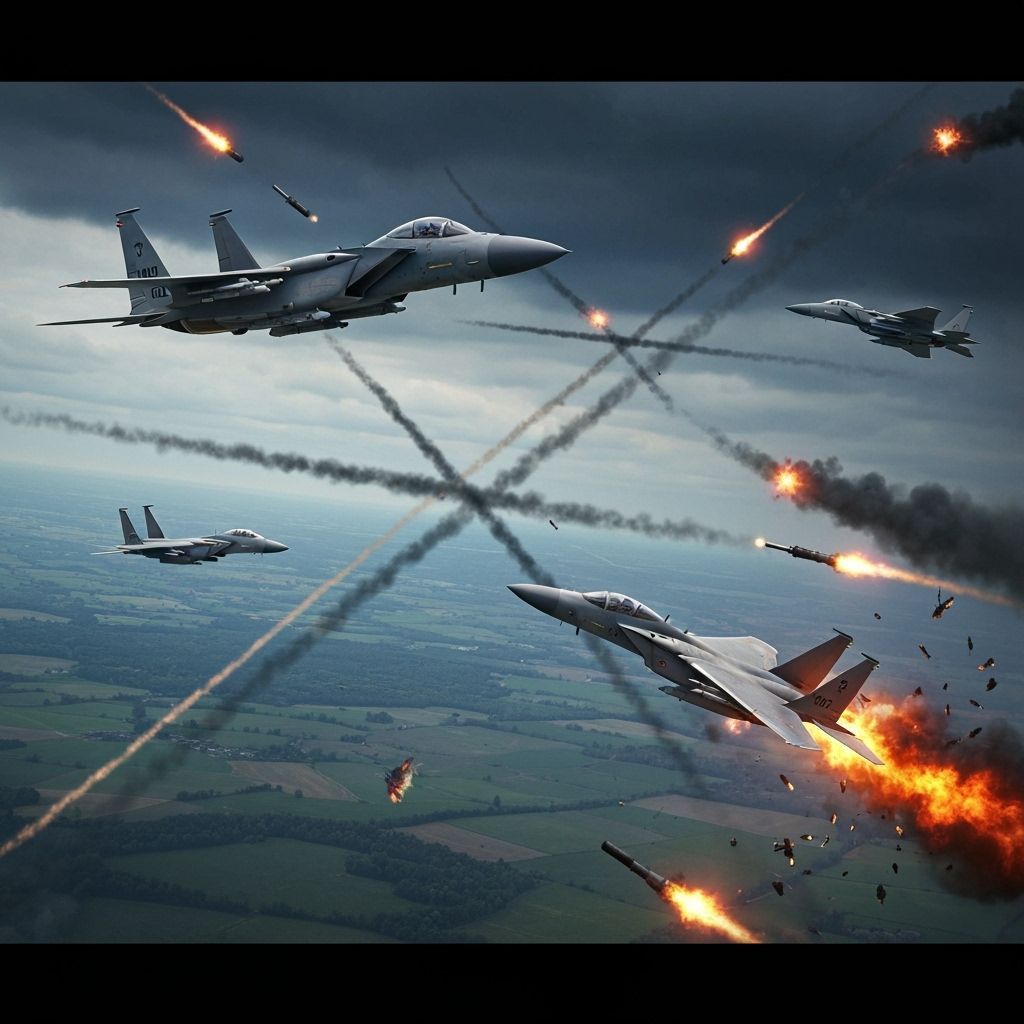 This image shows American F-15 Eagle fighter jets engaged in a chaotic aerial dogfight above a European landscape. Explosions light up the dark sky as one plane plummets in flames, rendered with cinematic realism.