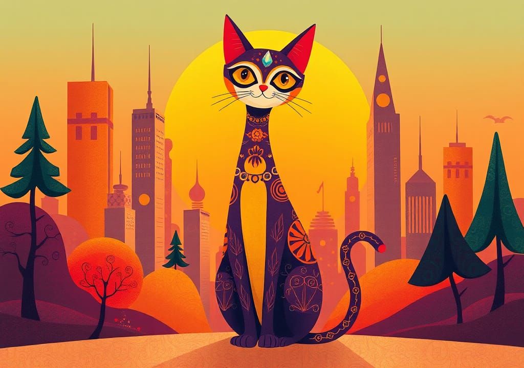 A stylized image of a whimsical cat with geometric patterns, set against a surreal sunset background. The art style blends modern illustration and folk art with vibrant colors and decorative motifs.