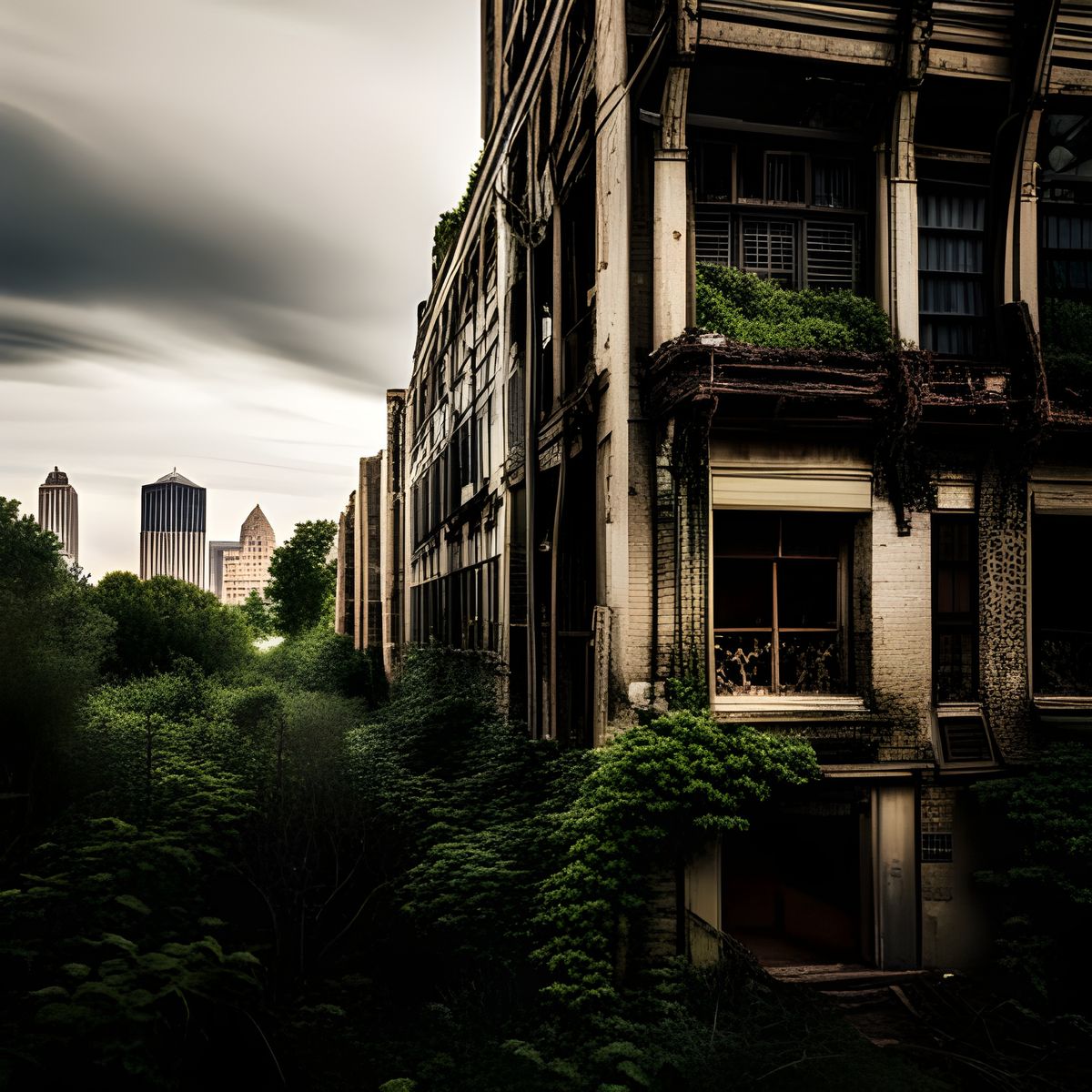 This image shows a post-apocalyptic vision of downtown Dallas in a dystopian future. Overgrown with vines, the crumbling cityscape is rendered in a highly detailed, gloomy aesthetic.