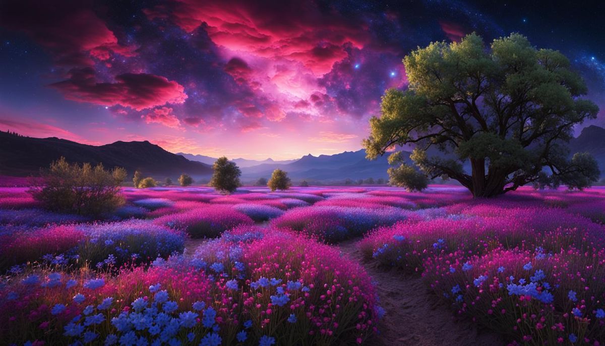 A breathtaking scene of a bioluminescent wildflower field under a cosmic sky. The image features radiant, shimmering colors, with a psychedelic and hyperrealistic aesthetic reminiscent of LSD art.