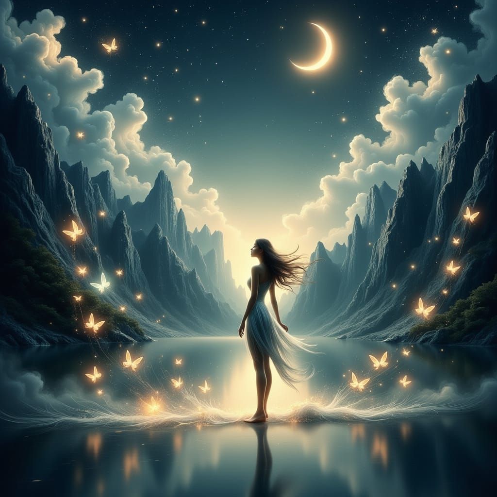 This serene and mystical image features a lone woman standing on the edge of a lake, surrounded by glowing butterflies and twinkling stars. Soft patterns of light coalesce into a heart shape, enveloping her in an aura of enchantment, set against a breathtaking backdrop of mist-shrouded mountains.