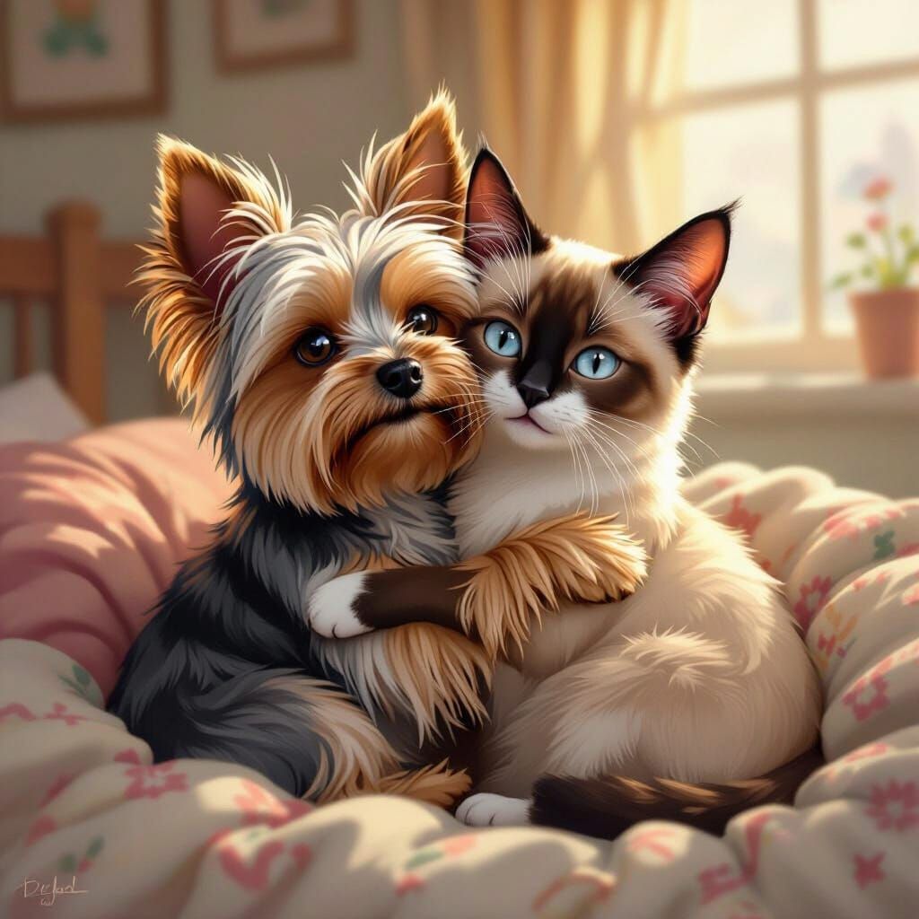 This image shows a Yorkshire terrier and Siamese cat in a loving embrace, both adorably featuring floppy ears. The warm, cozy scene is presented with whimsical and vibrant artistic elements.