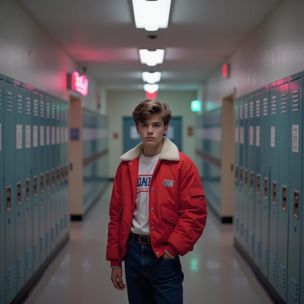 This image depicts a teenager in a high school hallway in the 1980s, complete with lockers and neon lights. The scene has an ultra-realistic style, with a muted color palette.