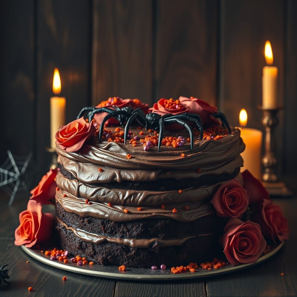 A richly detailed, intricately decorated Halloween cake set against a dark background, adorned with sugar-crafted spider webs, edible flowers, and sprinkles, illuminated by warm candlelight in a photorealistic, surreal still-life style