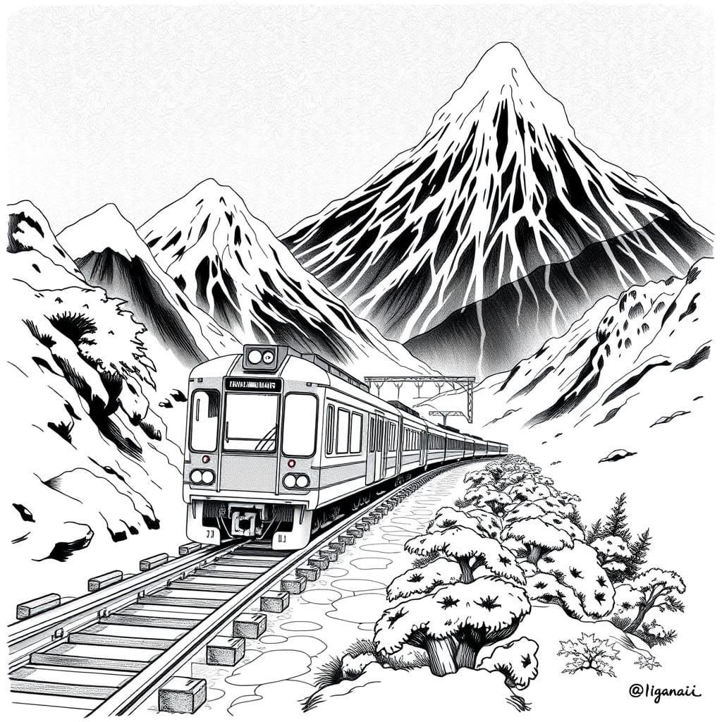 This image shows a Tokaido bullet train speeding through a mountainous Japanese landscape. The artwork evokes traditional Japanese ink drawings with precise lines in a monochrome palette.