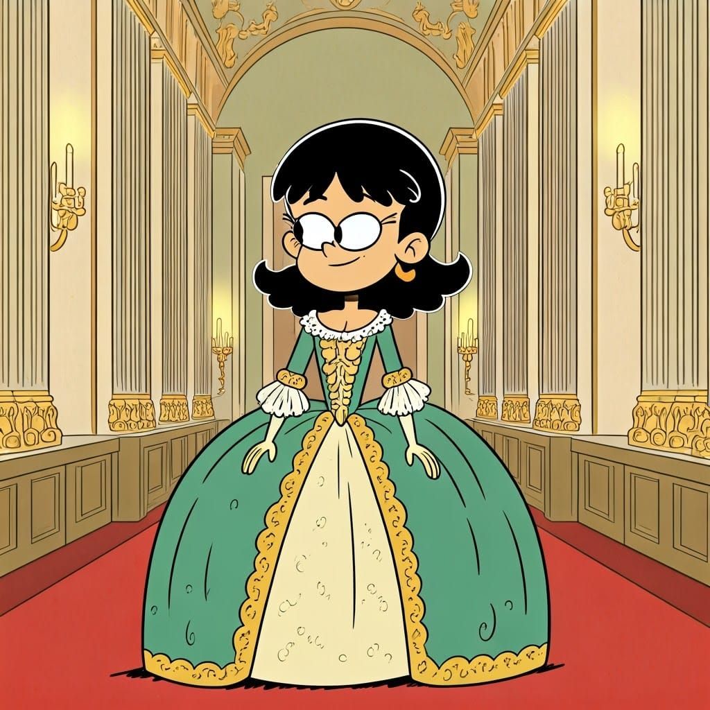 Stella Zhau, reimagined as a rococo noblewoman, attends a lavish ball in a grand palace, surrounded by opulent decorations and elegant guests. She wears a luxurious gown of silk and lace, with intricate golden embroidery and a charming expression on her face. The scene is rendered in The Loud House cartoon ...