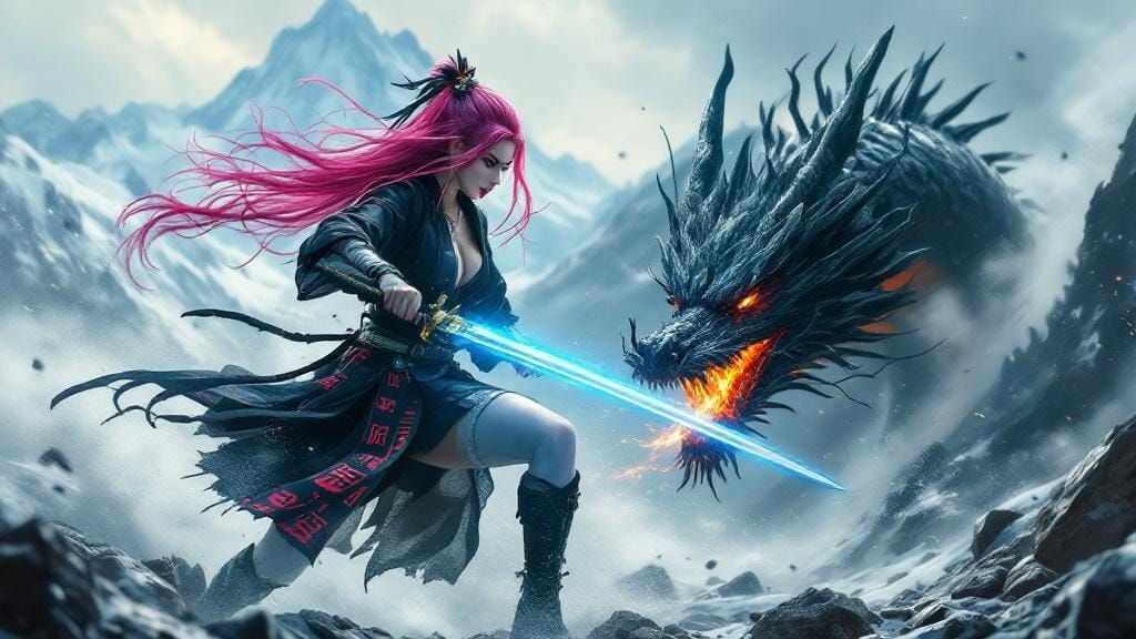 This image shows a samurai girl battling a black fire-breathing dragon. She wields a katana amidst snow-capped mountains and black stones, rendered with dark fantasy and futuristic elements in a neon-lit style.