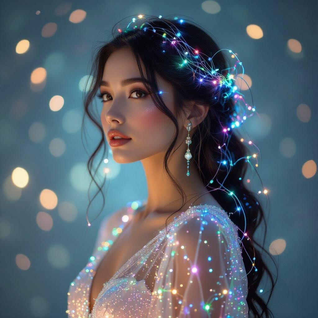 A digital portrait of a woman with glowing hair intertwined with fiber optics. She wears a dress of shimmering liquid crystal against a backdrop of stardust in a nouveau aesthetic.