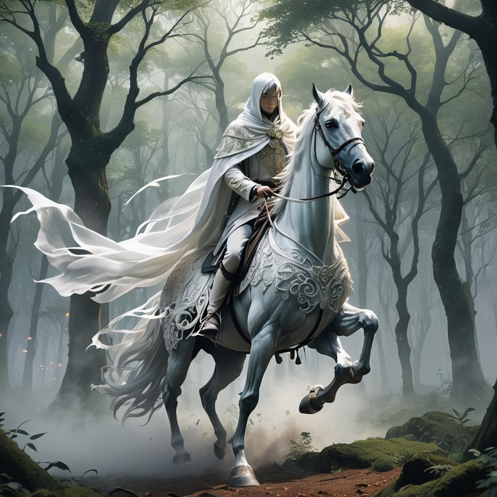 A spectral horse rider in a misty forest, rendered as anime-inspired 3D art. Ethereal mist swirls around the horse and rider, with intricate details and vibrant colors in a cinematic, atmospheric style.
