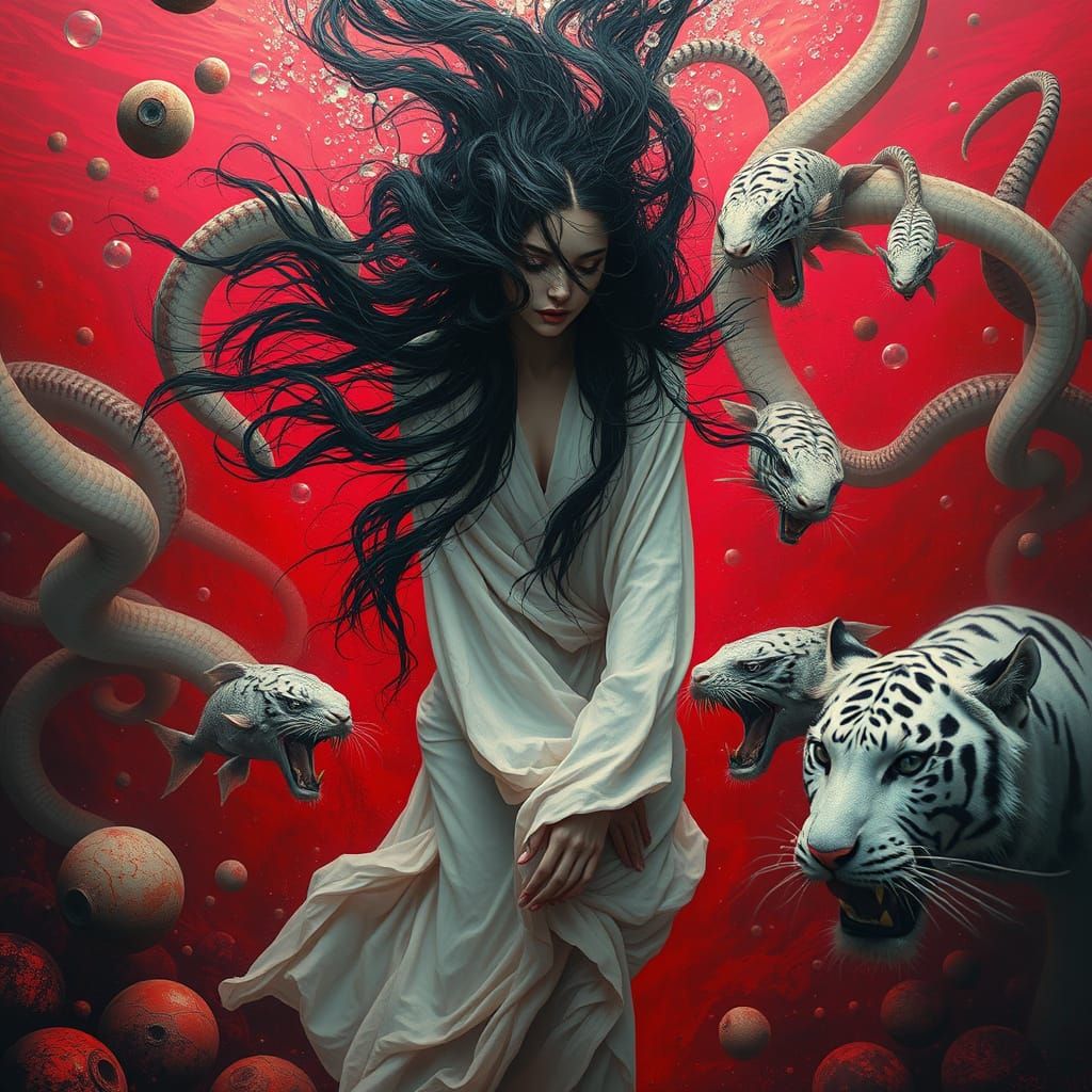 A striking picture of a goddess with long black hair diving underwater. She is surrounded by surreal marine life and vibrant colors in a dark, romantic style.