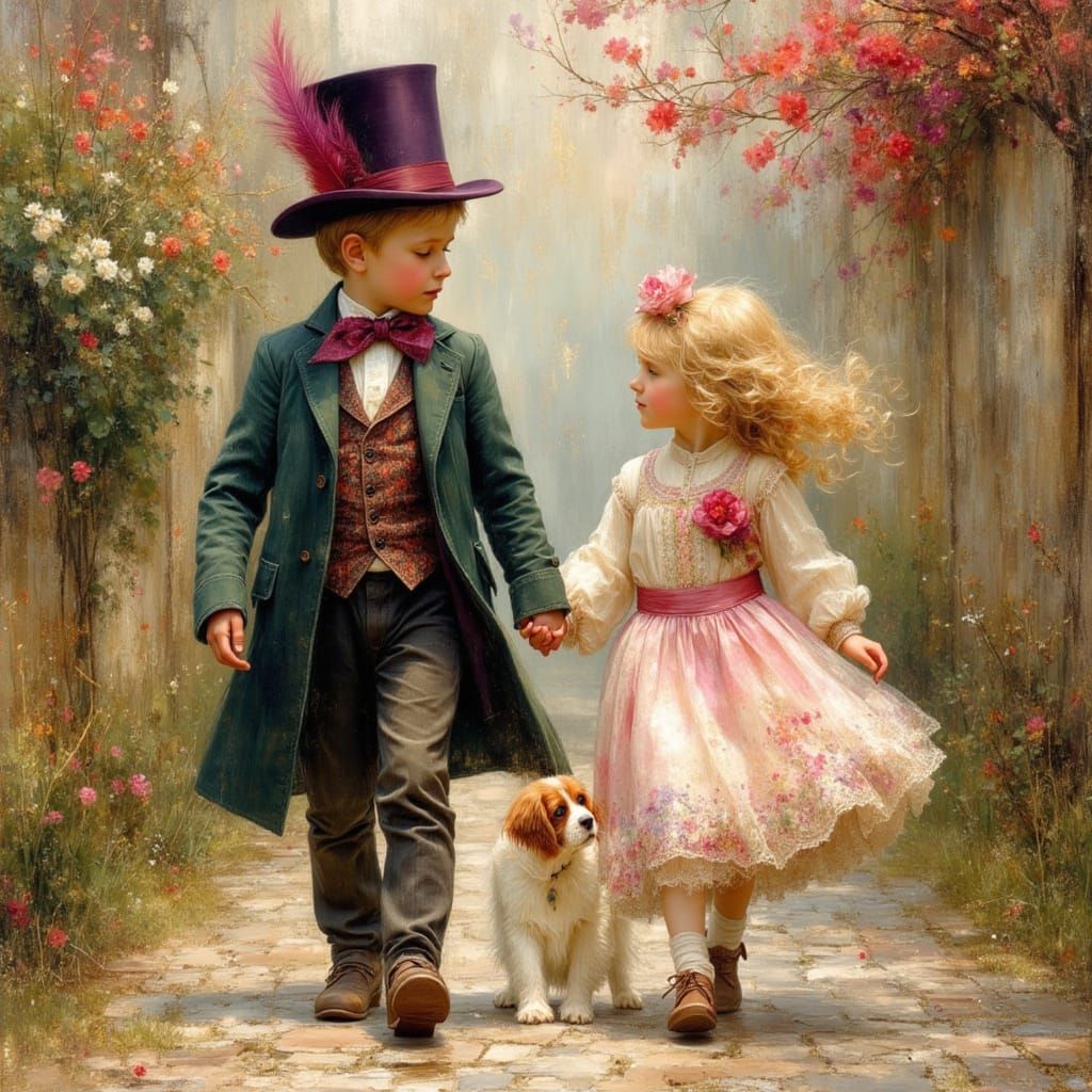A highly detailed painting of a young boy and girl walking hand-in-hand with their Cavalier King Charles Spaniel puppy. The old-fashioned style artwork uses light colors and dappled light.