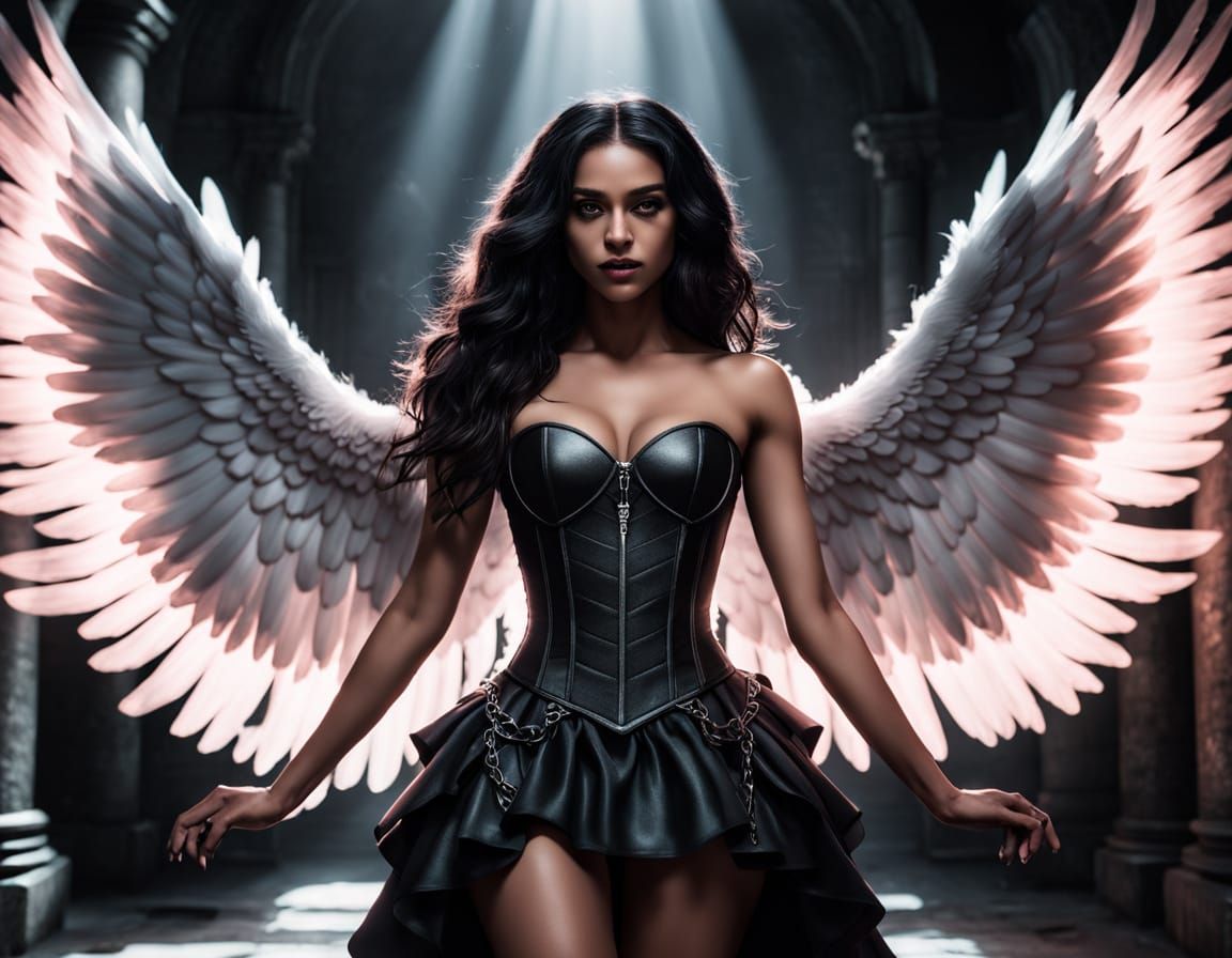 This image shows a beautiful Dominican woman with wings and a halo, chained in a dungeon. The artwork is a close-up in a fantasy art style, rendered with dramatic, cinematic lighting.
