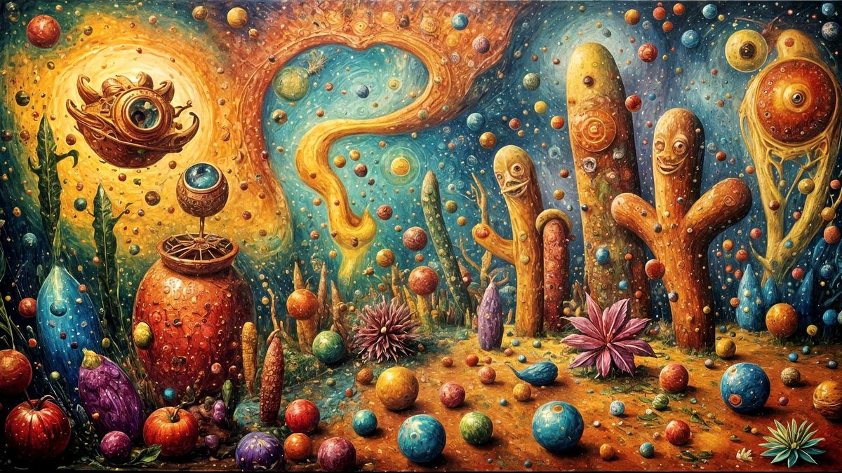 This AI-generated image features a surreal, abstract composition with elements reminiscent of blooming flowers and architectural structures, rendered in a unique artistic style.