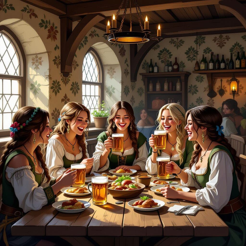 This image captures a lively scene in a rustic medieval tavern. Women are gathered around a table, enjoying hearty meals and drinks, depicted in a semi-realistic anime art style.