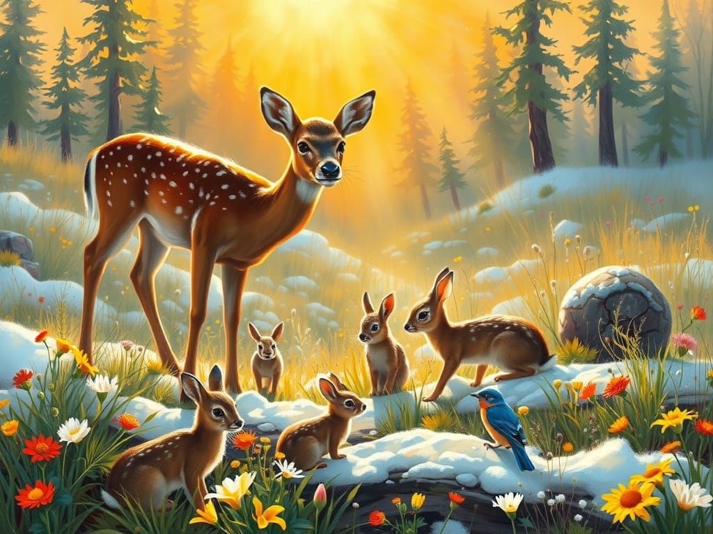 This image depicts a serene Alaskan spring morning, with warm sunlight casting a golden glow on the awakening landscape. Delicate wildflowers and small animals, freshly emerged from hibernation, inhabit this idyllic scene, rendered in exquisite detail and texture, evoking a sense of hope and renewal.