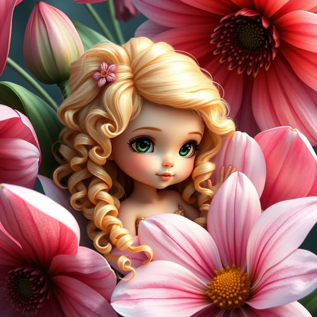 This image features a beautiful blonde girl, like Thumbelina, emerging from a large flower. Rendered in a 3D cartoon style with watercolor effects, it has a whimsical, dreamlike quality.