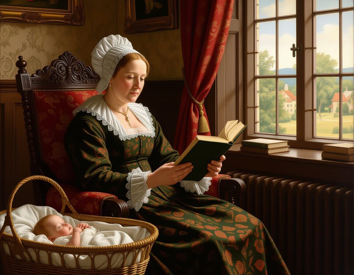 This image shows a middle-aged woman in period clothing sitting in a chair, reading a book, with a baby in a basket at her feet. Rendered in the style of a Renaissance tapestry.