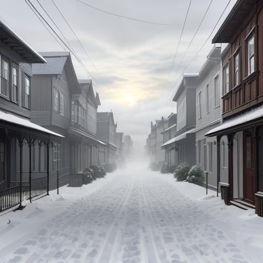This image depicts a charming antique street in an 1869 town, featuring identical houses with gabled roofs and snowy details. Rendered in a watercolor and encaustic style, it captures a magical, foggy winter day with faint sun rays.