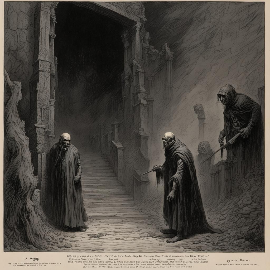 This image shows a horrific scene reminiscent of Gustave Doré's engravings. The artwork evokes a dark fantasy aesthetic.