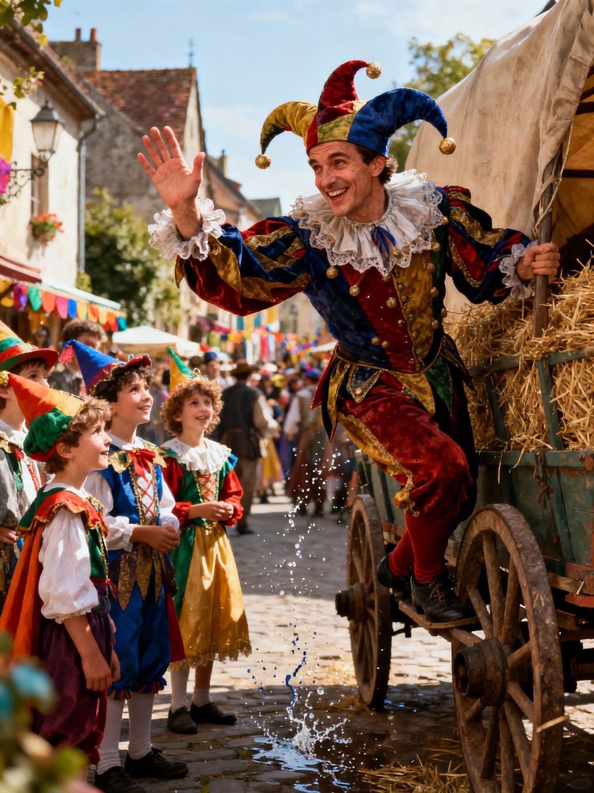 This image shows a court jester boarding a hay wagon in a busy village, waving goodbye to children in fancy dress. Rendered with dramatic lighting and deep colors, this splash art features intricate detail and sharp focus.