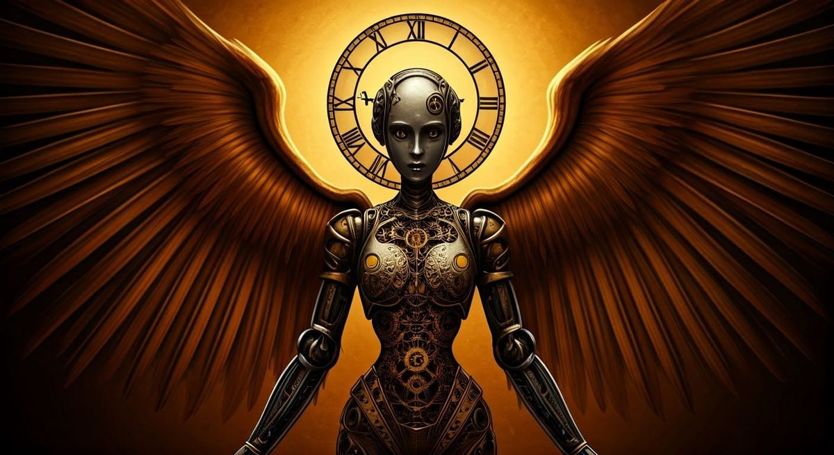 This image shows a meticulously crafted clockwork angel with visible gears, set against a golden backdrop. The artwork blends steampunk and futuristic themes with a vintage aesthetic.