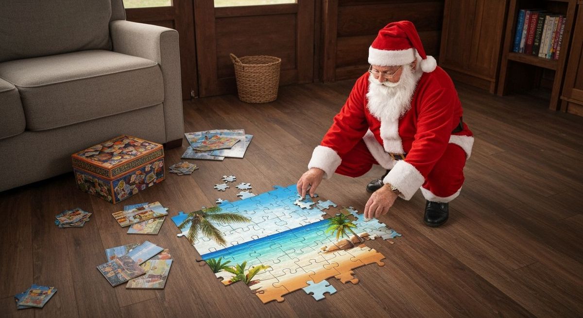 This image shows Santa Claus on a cabin floor, piecing together a puzzle that features a beach vacation scene. A festive and unexpected holiday image.