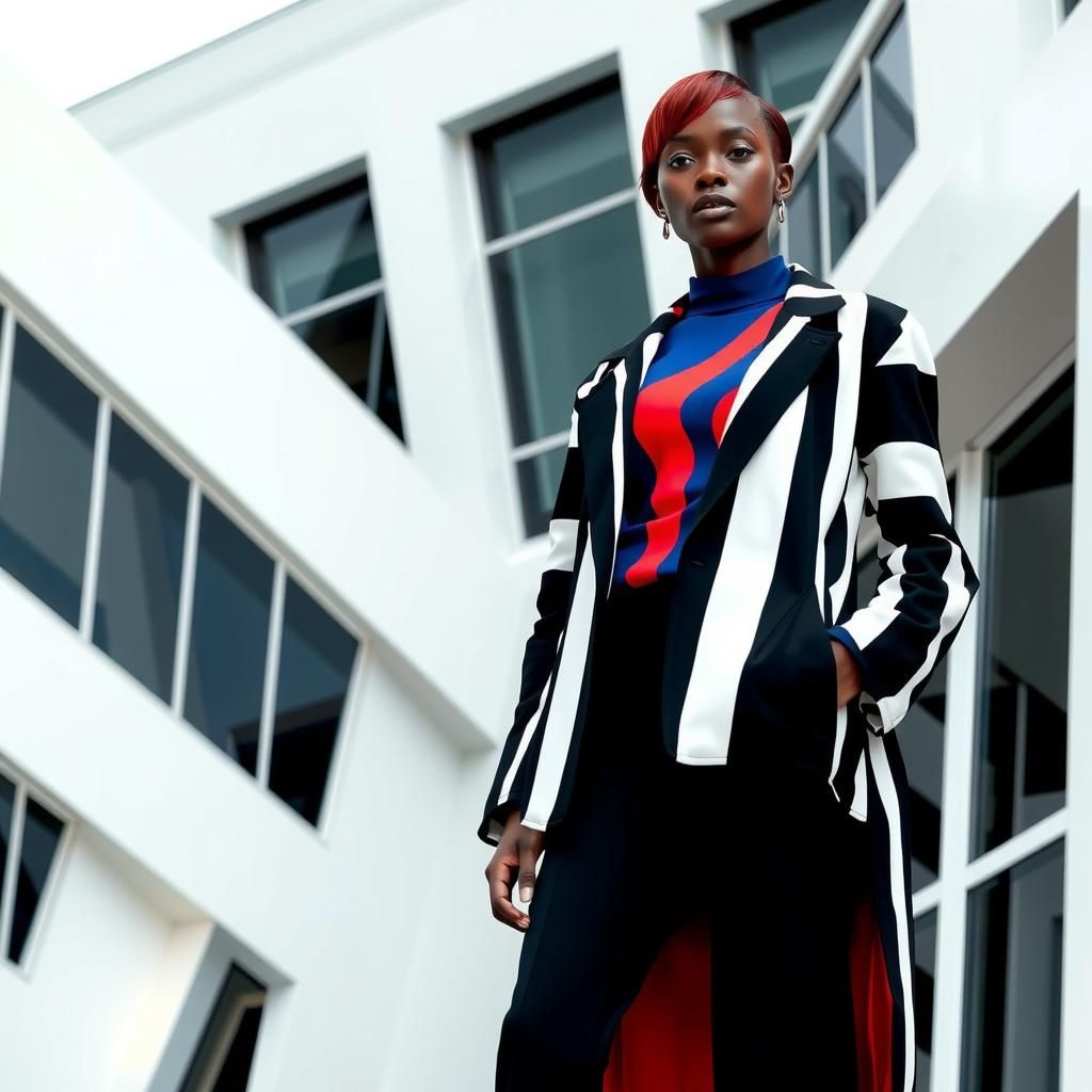 A high-fashion editorial image of a woman with striking skin and a geometric outfit. The background features modern architecture with sharp lines, creating a high-contrast aesthetic.