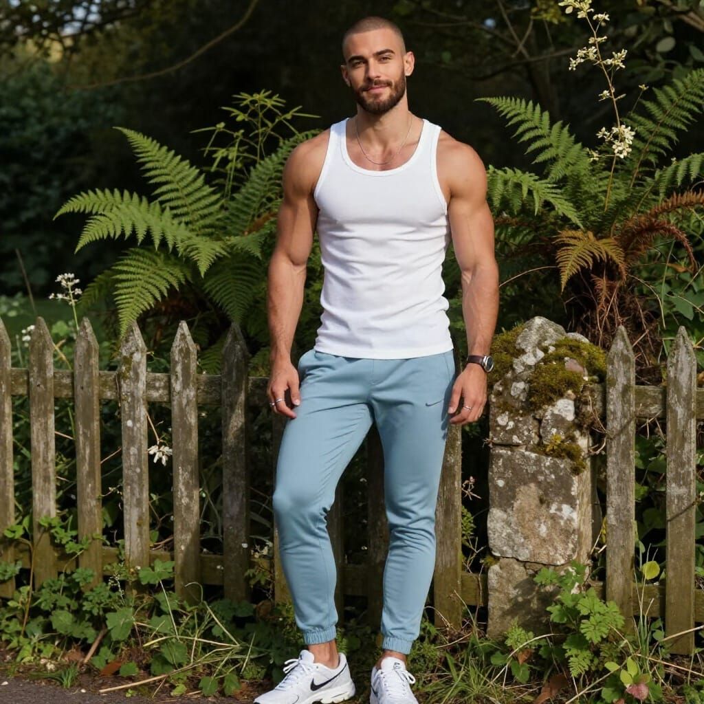 A photorealistic portrait of a handsome young man with an athletic build, standing confidently by a stone fence covered in lush greenery. Natural side lighting accentuates his features for an editorial look.