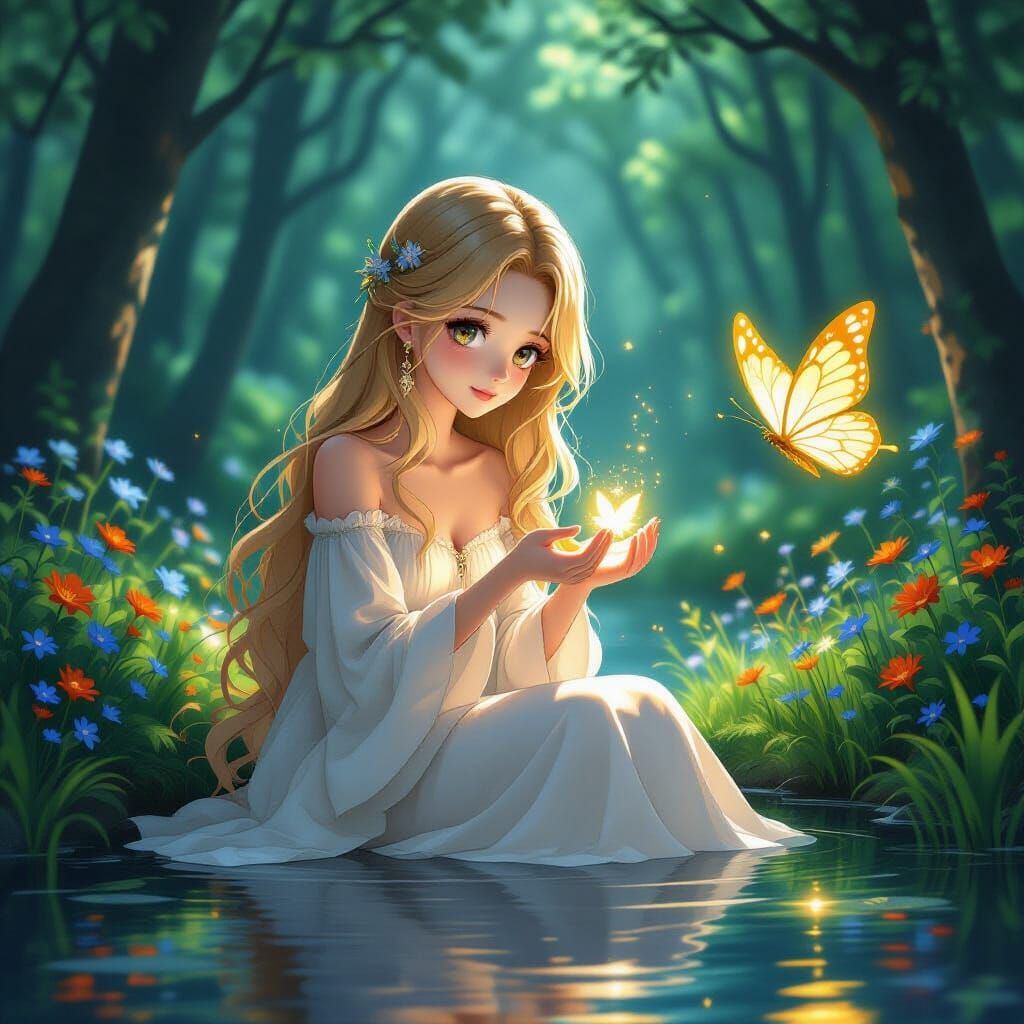 A digital anime illustration of a young woman with blonde hair sitting by a pond in a magical forest. She holds a glowing butterfly, surrounded by lush foliage and wildflowers, with soft lighting and reflections.
