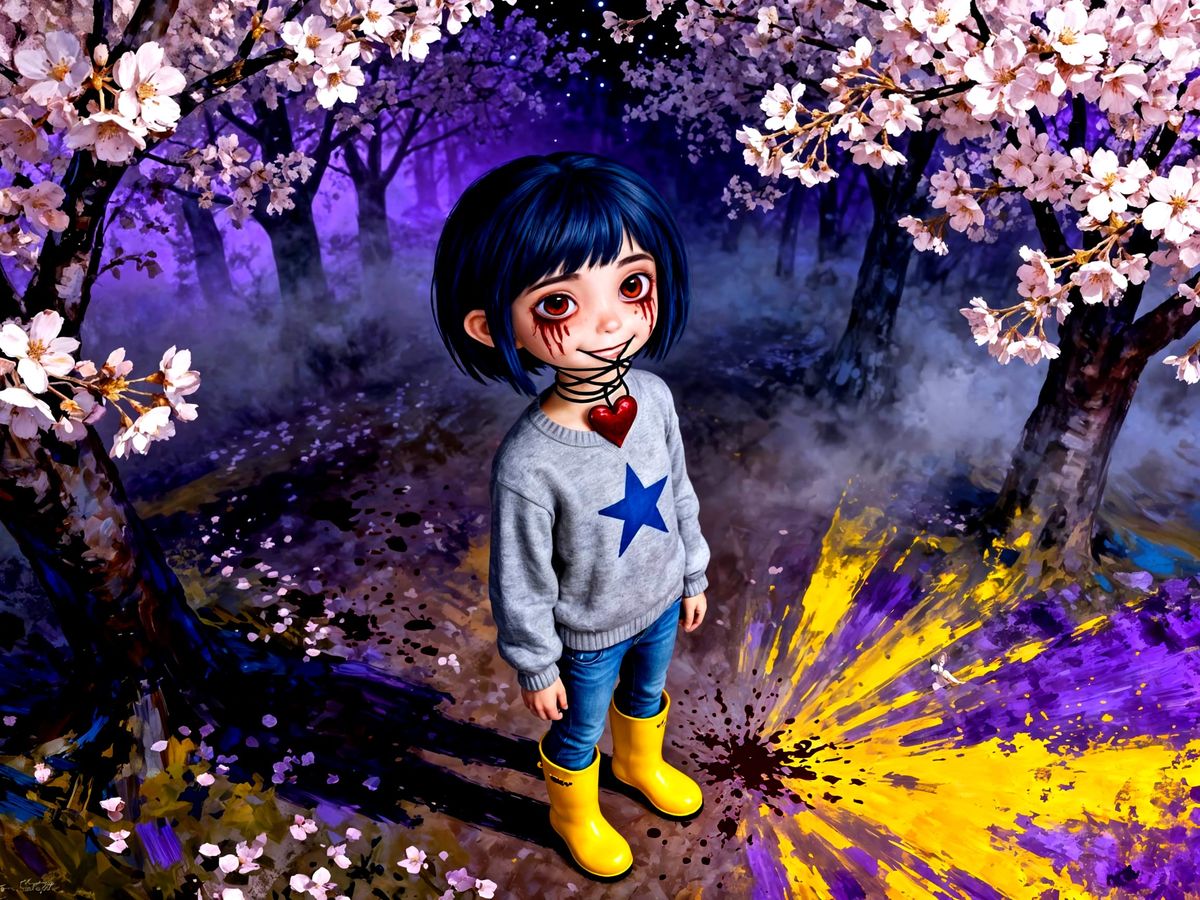 Young girl with short navy blue hair, bloody eyes with black button-downs, a bloody heart-shaped mouth cinched shut with black thread, and an awkward smile. She's wearing a light gray sweater with a simple blue star pattern, jeans, and yellow rain boots. She's standing in a cherry blossom forest at night. High angle camera. Creepier art style like Coraline and the Secret Door, Mark Ryden, Margaret Keane. Horror and visceral film art. Splatter, impasto, realist impressionist, and experimental art styles.