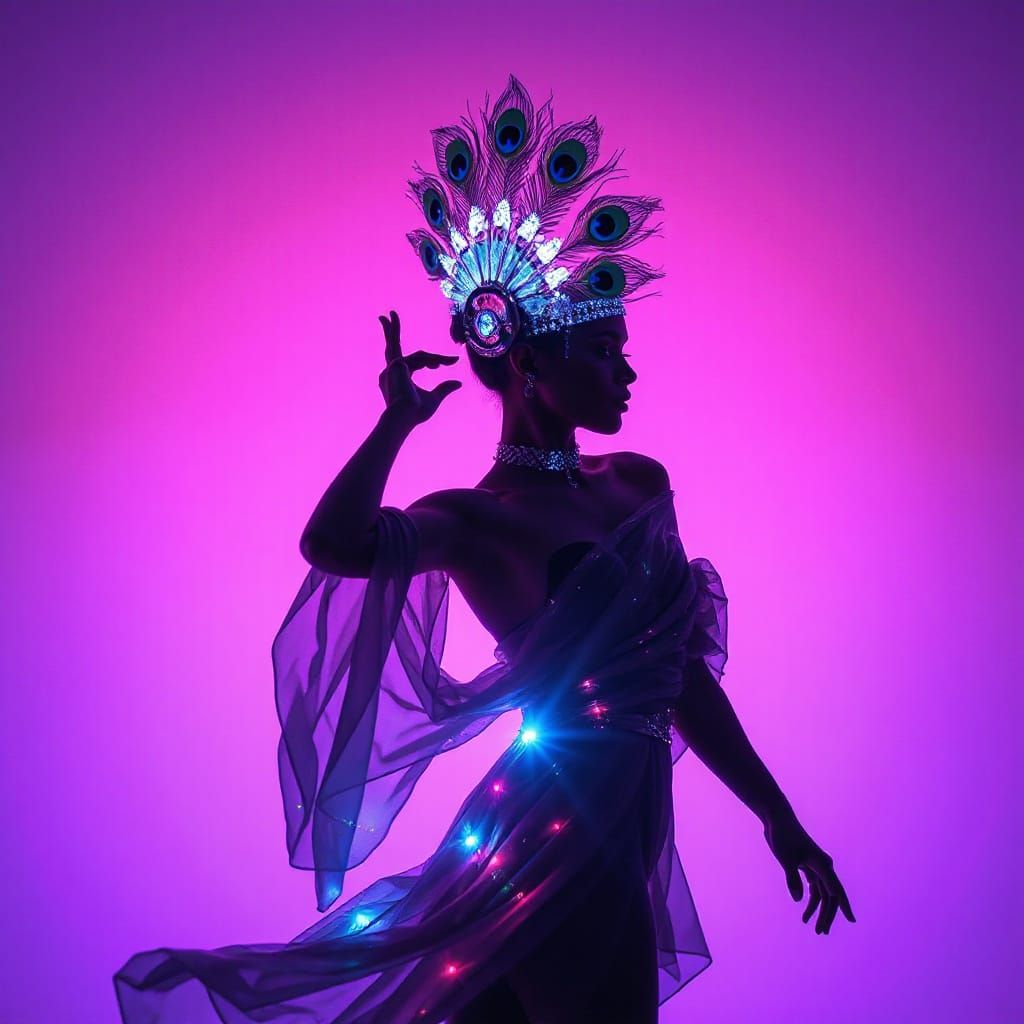 A digital rendering of a cyberpunk dancer in silhouette. The dancer wears a holographic peacock feather crown and Renaissance jewelry, set against a gradient backdrop with brocade circuit patterns.