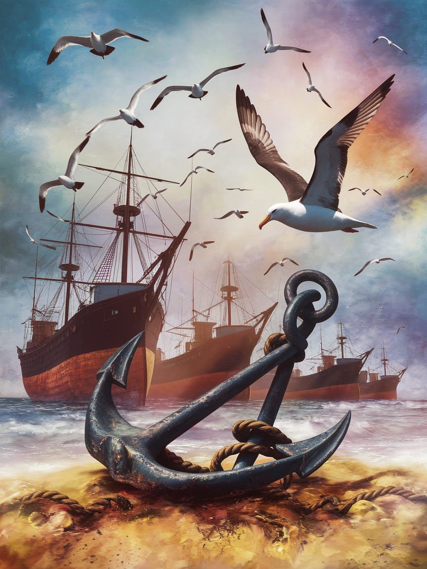 A vibrant double exposure shows ships in a busy port under a sky full of seagulls. An albatross sits on an old anchor on the shore. The vivid coastal scene is painted on oil canvas with watercolor sfumato.