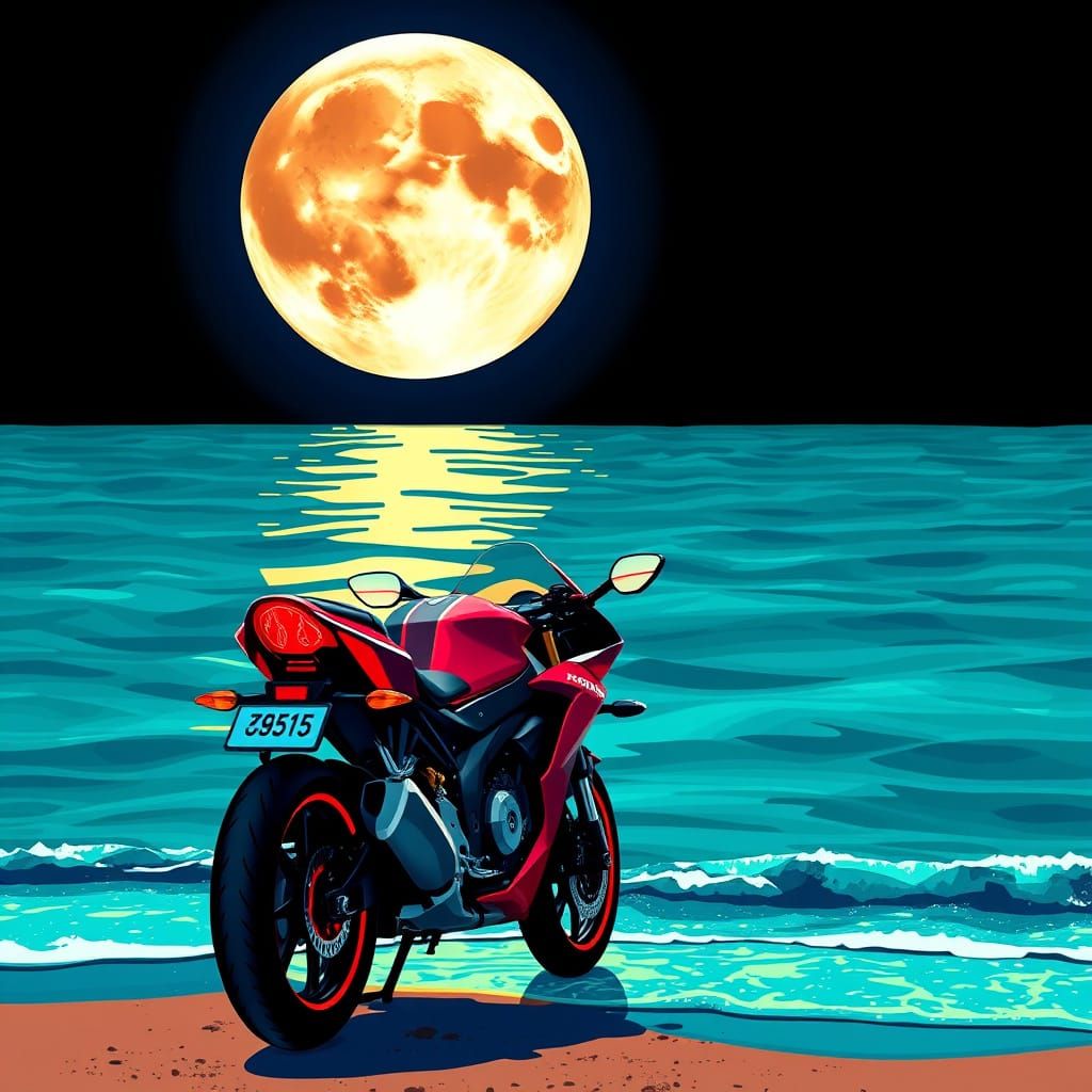 A vibrant full blood moon reflecting on the ocean with a honda motorcycle Picasso style