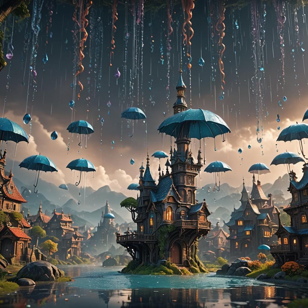A fantastical digital painting of a cute raindrop exploring the world. The image features intricate details, deep colors, and complementary color palettes, rendered in 8k resolution.