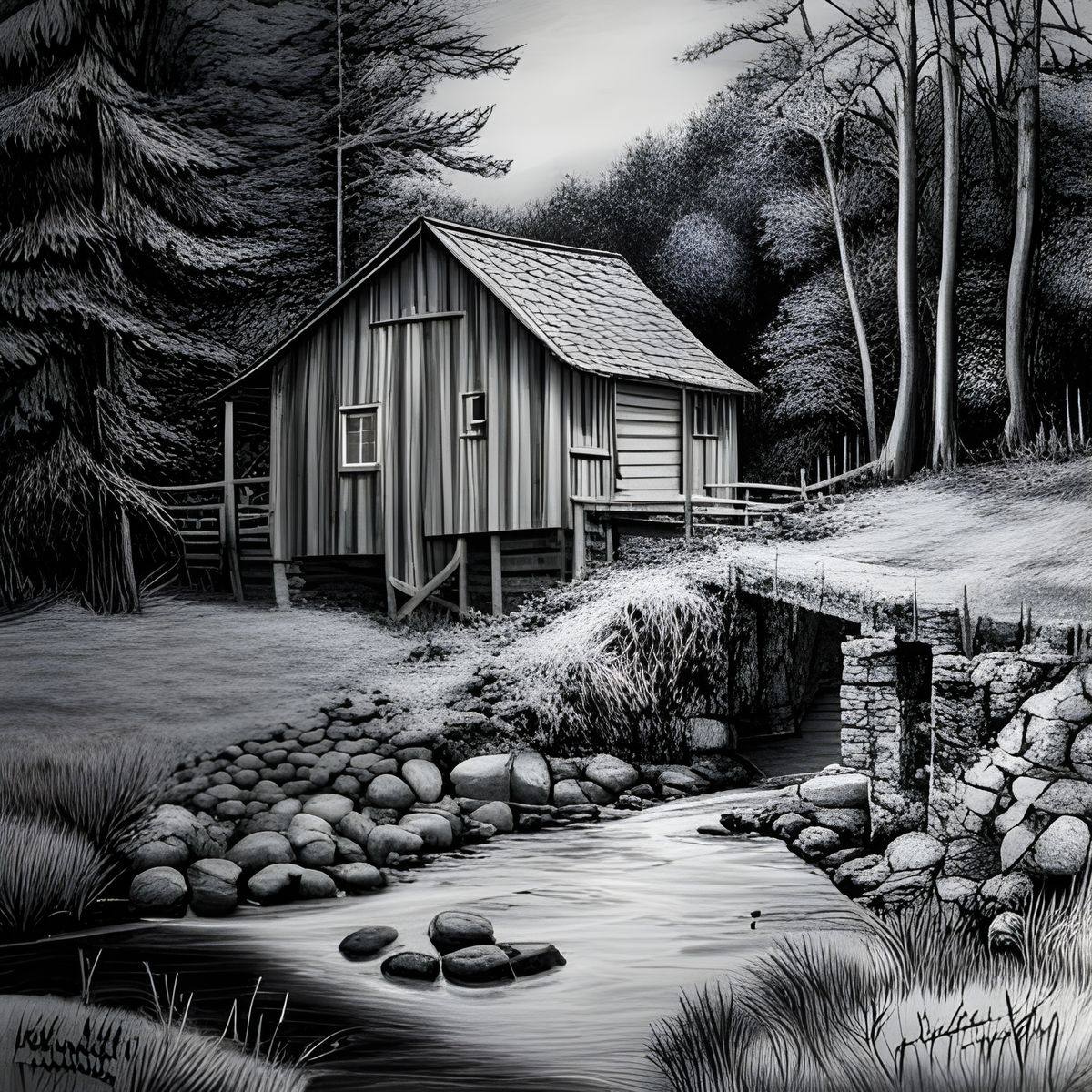 This image shows a cabin nestled in a forest, complete with a small stream and watermill. The scene is rendered in a highly detailed charcoal drawing style.