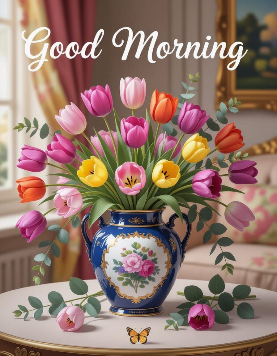 This digital illustration showcases a vibrant bouquet of multi-colored tulips and greenery in an ornate vase, set against a softly lit luxurious room. Botanical art style with intricate detail.