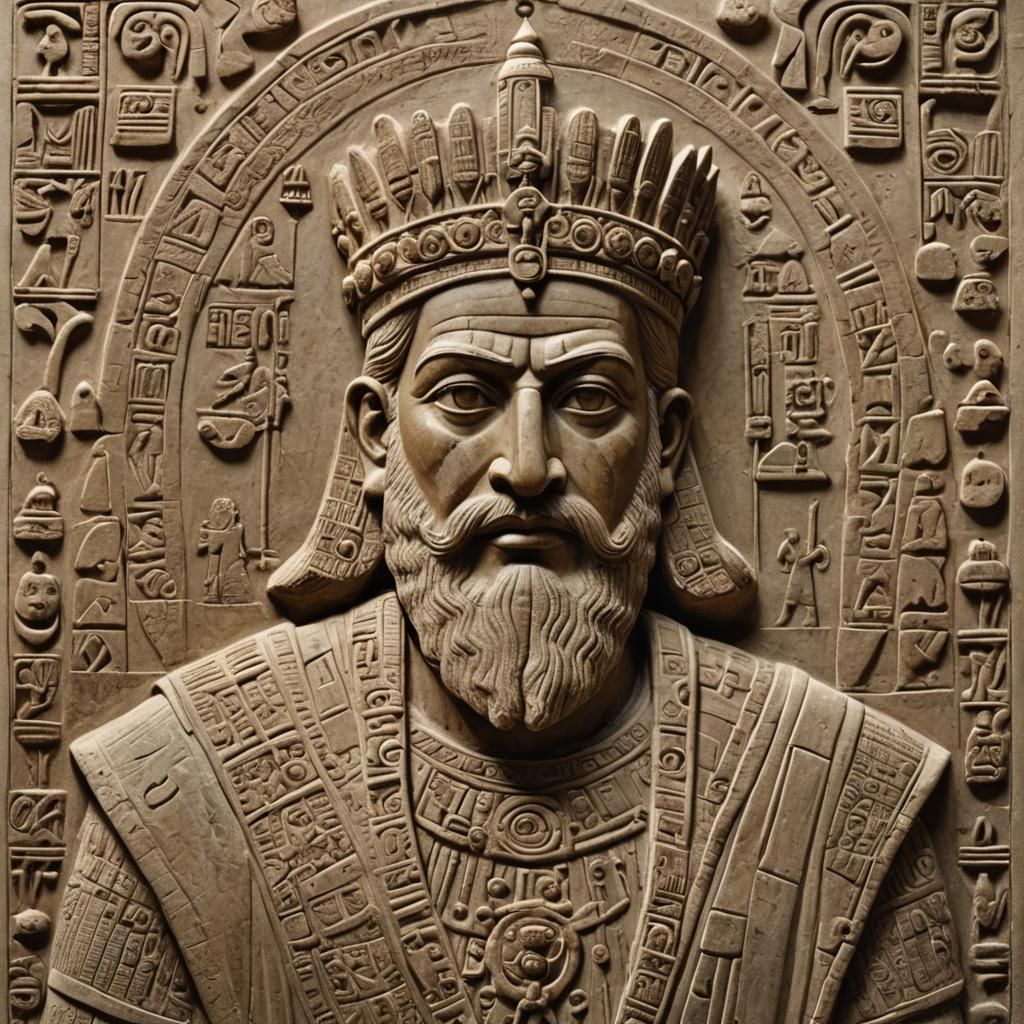 A detailed relief carving of Šamaš-šuma-ukin, a Mesopotamian king. The image highlights his regal features, elaborate attire, and symbols of power, showcasing impeccable craftsmanship and historical grandeur.