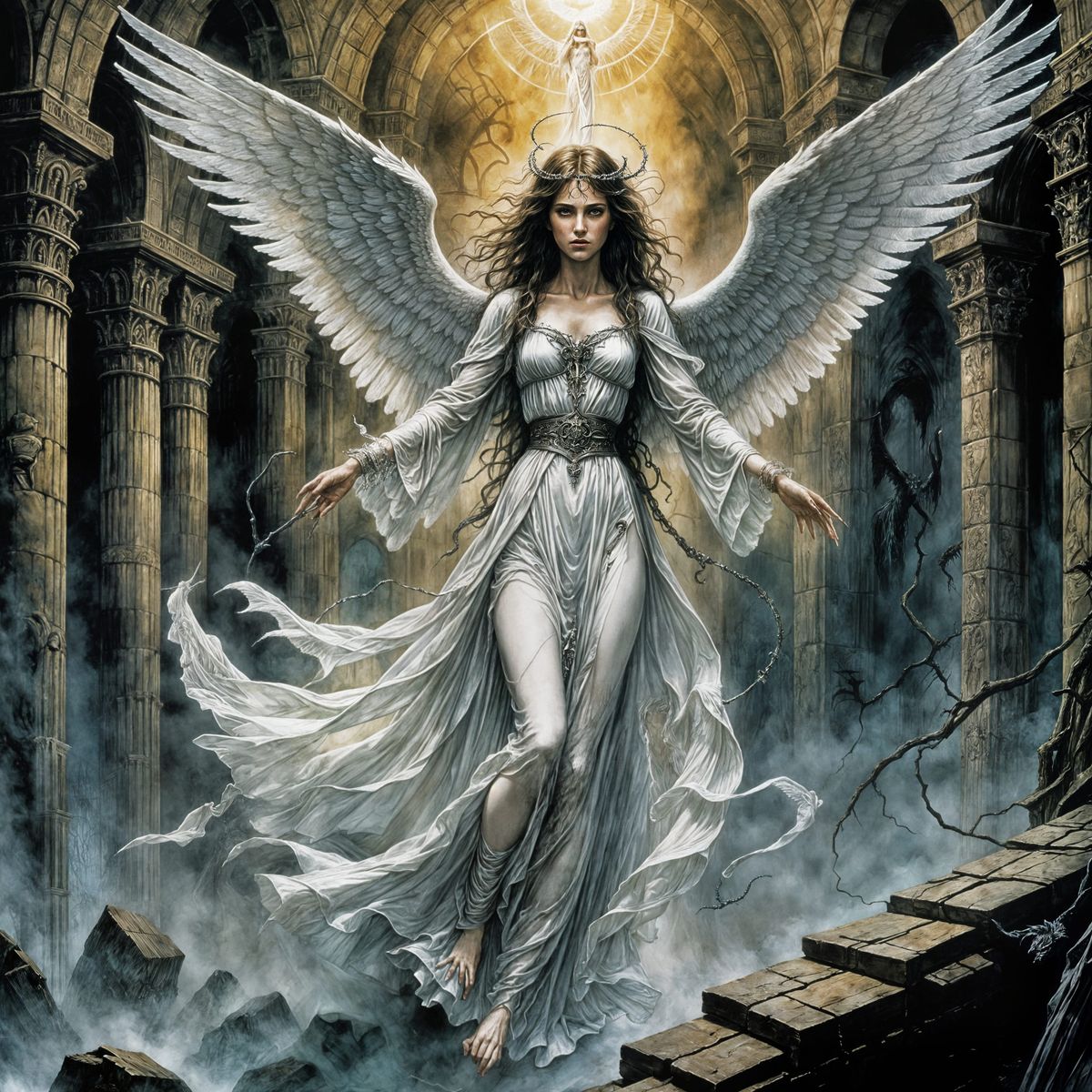 A detailed illustration of a ghostly, angelic figure floating through a sinister dungeon. The artwork evokes a fairytale aesthetic with see-through elements.