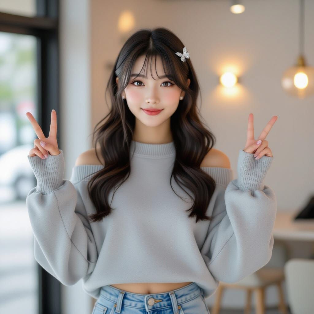 This image captures a young girl in a dorm room, photographed with a wide-angle lens at f/5.6. She stands confidently, making a peace sign.