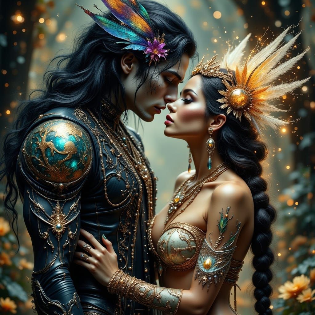 A striking butch night fae with ghostly pale skin, sharp features, and iridescent wings, embracing a beautiful sunlight fae with dark brown skin, golden tattoos, and blonde braids, in a bold, gothic, and intense color palette.