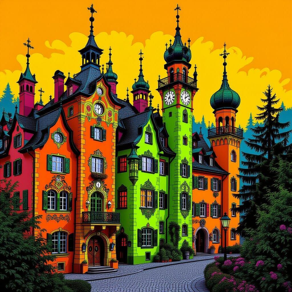 A vibrant display of neon orange and green blending together. The image features whimsical architecture in a colorful, eclectic style with mystical undertones.