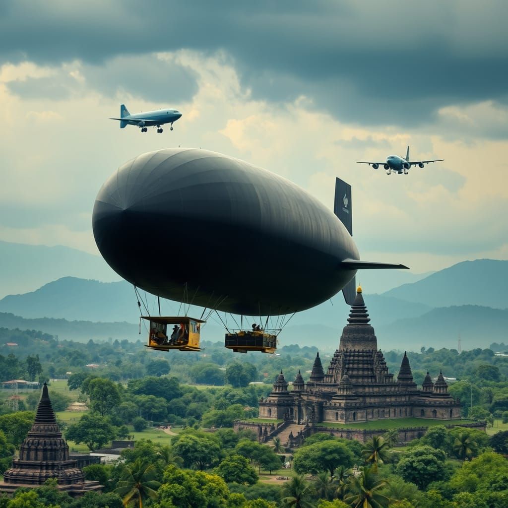 A dramatic image of a black zeppelin and biplane soaring through storm clouds. Borobudur temple rises in the background, surrounded by lush vegetation and stupas in a surreal, geometric style.