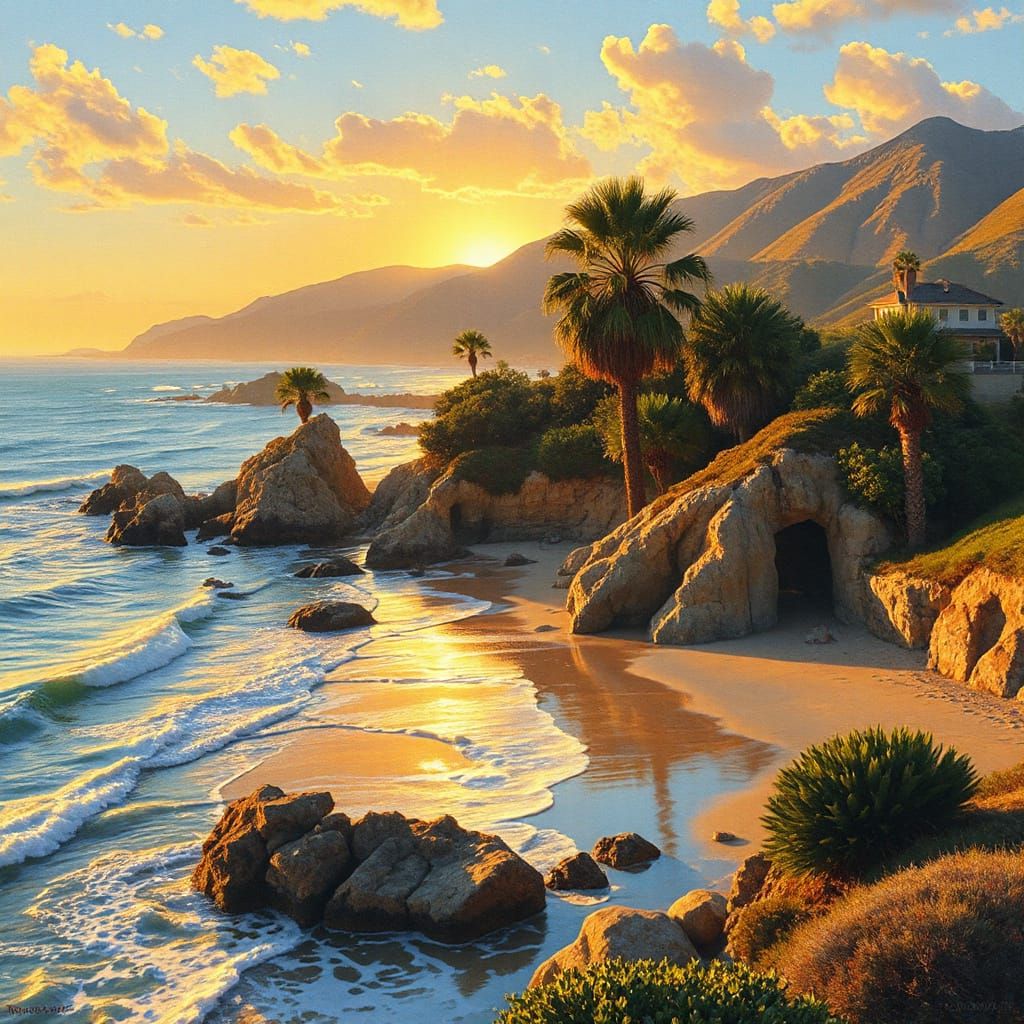 This image shows a sun-drenched California coastline at golden hour, featuring palm trees and beaches. The scene is rendered in a luminist style reminiscent of impressionist paintings.