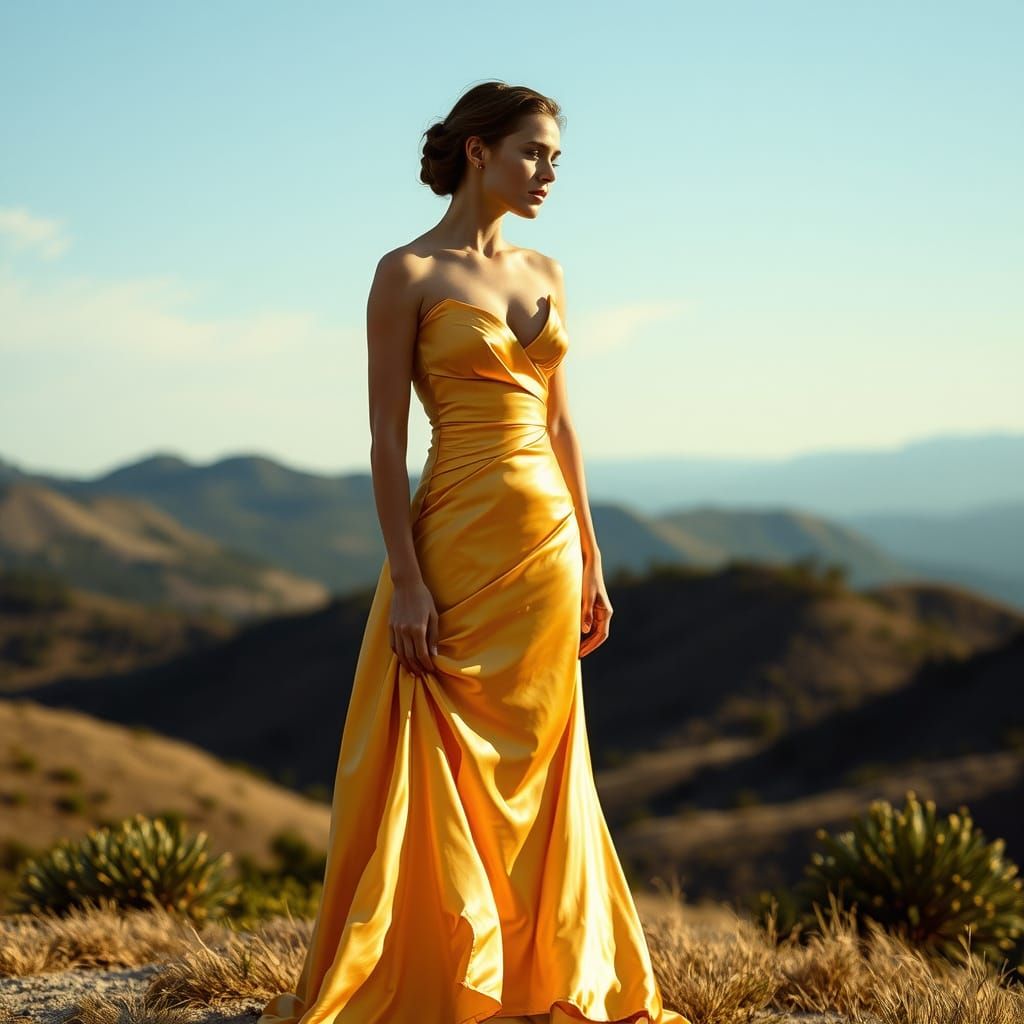 This image shows a stunning woman in a golden gown in a sunlit landscape, captured with cinematic techniques. The photograph features soft bokeh and natural lighting to enhance the subject.