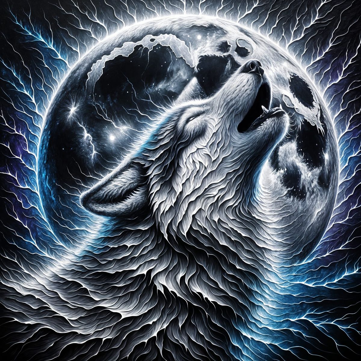 This image shows a majestic wolf howling at an electrifying full moon in the night sky. The portrait is rendered in shades of silver, black, and white, with oil painting techniques.